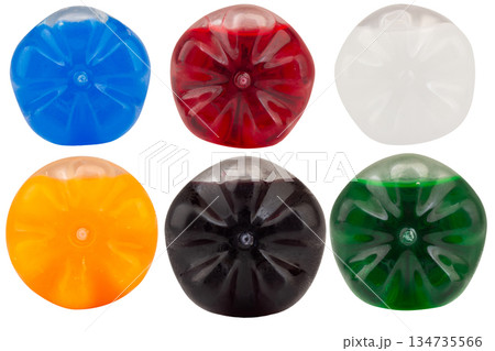 color blue red yellow orange green purple soft drink bottle isolated on white background view top