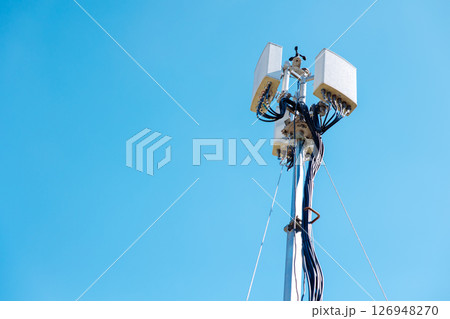 omni setup outdoor wifi, wireless internet network access point tower, 5G antenna against clear blue sky
