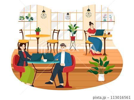 Internet Cafe Vector Illustration with Building for Young People Playing Games, Workplace use a Laptop, Talking and Drinking in Flat Background