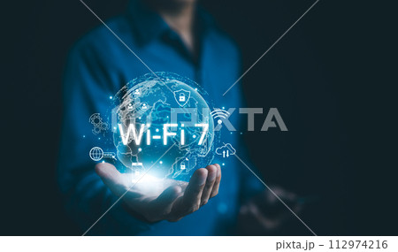 Global Wi-Fi Connectivity and Internet Technology Concept. A person holding a holographic globe highlighting Wi-Fi 7 connectivity, representing the global reach of modern internet technology. wifi7,