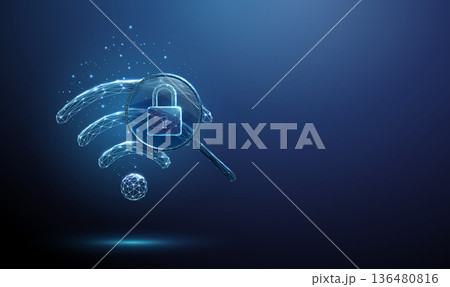 3d wifi icon under magnifying glass with padlock inside lens. Wireless security analysis, cybersecurity audit, data encryption, safe communication concept.