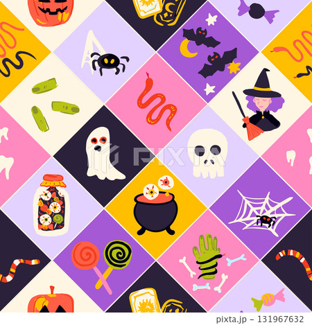 Whimsical folk art. A seamless pattern in a naive, fairytale style with a rich color palette, rustic comfort, holiday spirit, and nature. Easter motifs.