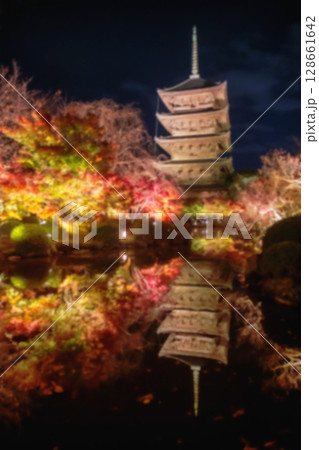 Blurred Toji 5 story pagoda and autumn garden light up, Kyoto