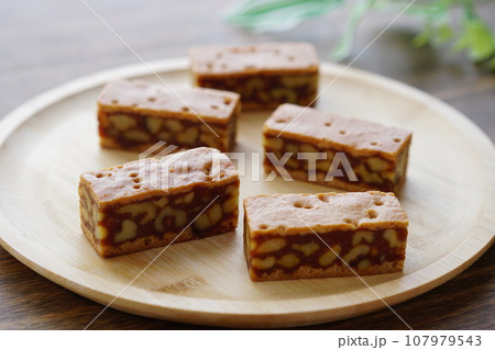 Nougat or white caramel with hazelnuts and pistachios and citrus pieces. White nougat with nuts