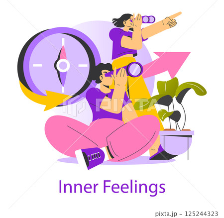 This illustration represents the concept of inner feelings, showcasing individuals exploring their emotions through thoughtful observation and reflection amid symbolic visual elements.