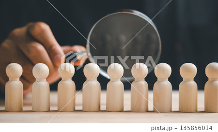 A hand holding a magnifying glass over a row of wooden figurines. The magnifying glass focuses on one figurine, emphasizing the importance of individual selection.