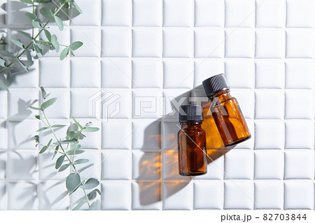 兩瓶香油和桉樹葉。有復制空間。