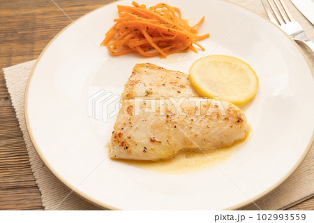 鮭魚meuniere 鮭魚meuniere 盛在白盤上