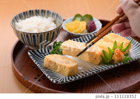 日本日式早餐形象(米飯、玉子燒、炸雞、泡菜、味增湯、土佐煮竹筍)