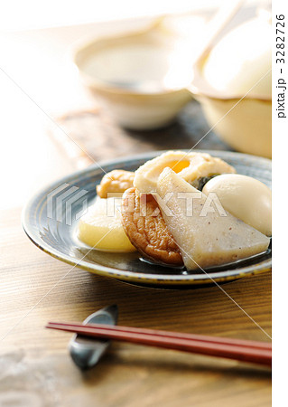 注意)蒸汽是修飾合成。 “標準菜Oden冬天在陶罐”圖像。蘿蔔,雞蛋,紅薯,牛肉條紋。