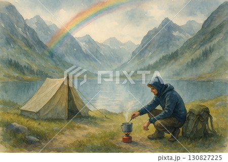 鍋子和山火的夜景 | 鍋子和夜晚戶外的水彩畫