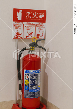 滅火器的使用方法。圖示為滅火器使用方法。附有英語和日文標示。