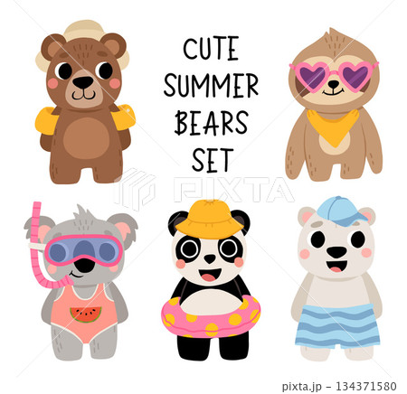 Cute summer bear set. Panda, koala, grizzly, polar, sloth. Kawaii cartoon character in sunglasses. Baby greeting card template. Notebook cover, tshirt.