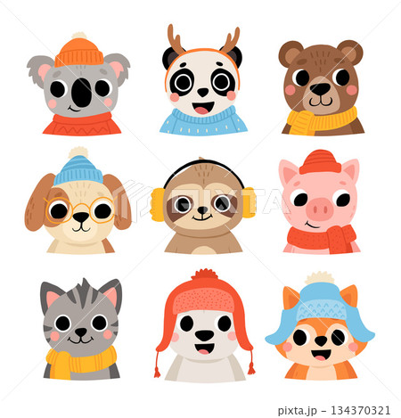 Cute wild and domestic animals set in winter clothes, including brown bear, polar bear, panda, koala, sloth, cat, dog, pig, fox. Cartoon kids illustration with hats and sweaters.