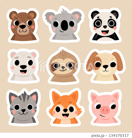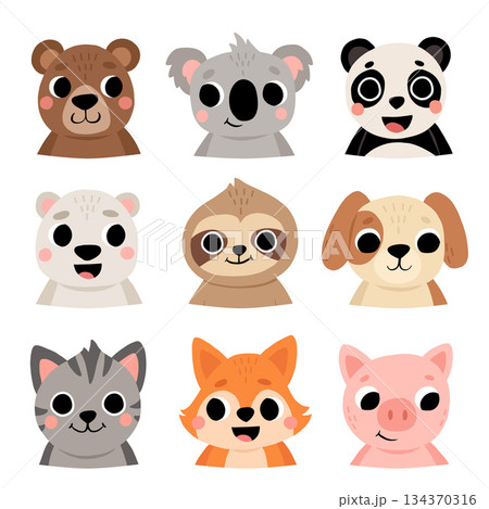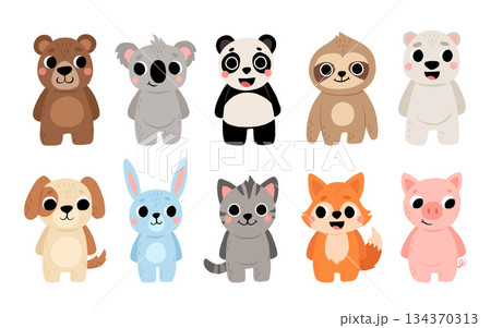 Cute wild and domestic animals set including brown bear, polar bear, panda, koala, sloth, cat, dog, pig, fox, and rabbit. Cartoon kids illustration.