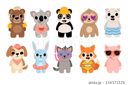 Cute summer tropical animals travel. Including brown bear, polar bear, panda, koala, sloth, cat, dog, pig, fox, and rabbit. Cartoon kids illustration.