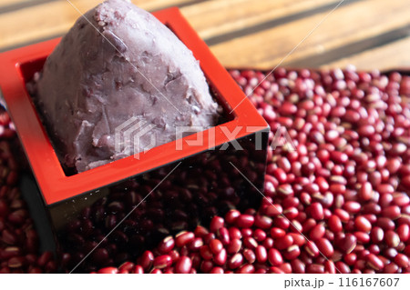 日式糕點的原料,袋裝穀物,煮沸的小月