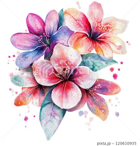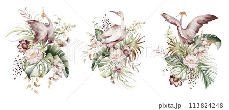 Pink ibis with tropical flowers and leaves. Watercolor illustration of a flamingo. Waterfowl of the American park. Exotic animal on a white background. Monstera, orchid and banana leaf.