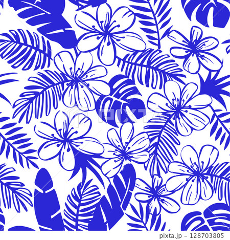 Vector seamless pattern with blue tropical leaves and flowers. Abstract tropical print