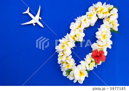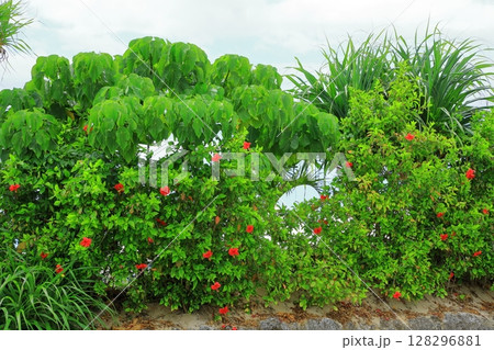 沖繩的蔚藍大海、藍天和鮮紅的芙蓉