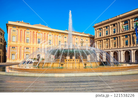 Piazza Raffaele De Ferrari square with fountain and Palazzo della Nuova Borsa Palace barocco style building in historical centre of old city Genoa