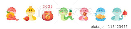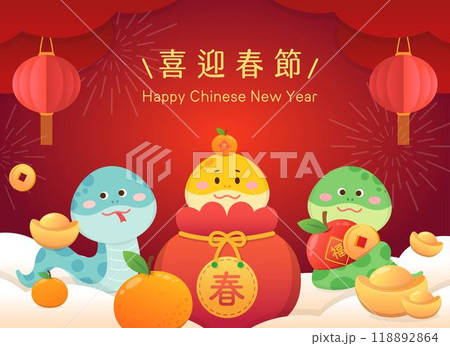 一組可愛俏皮的蛇的吉祥物或腳色,中國農曆新年或元宵節,湯圓,橘,金元寶,鳳梨,鞭炮