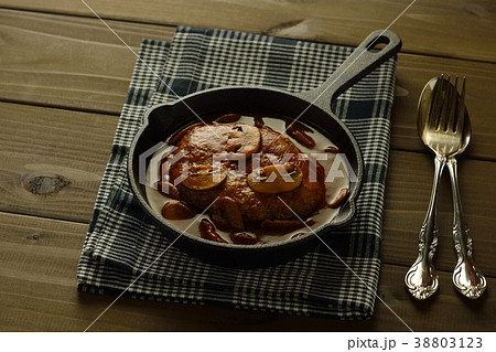 燉漢堡牛排佐蘑菇、半釉醬和火腿沙拉