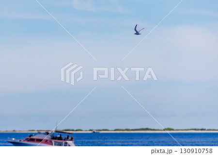 與離岸飛翔的燕鷗一起奔跑。沖繩縣島尻郡慶良間諸島-2025年6月27日,搭乘「座間味女王3號」