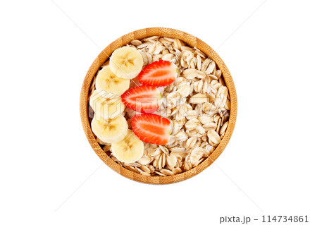 organic oat flakes in bowl with strawberry and sliced banana isolated on white background