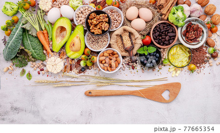 Ingredients for the healthy foods selection. The concept of superfoods set up on white shabby concrete background with copy space.