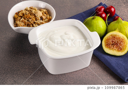 Natural yogurt with strawberry granola and fresh berries with spoon.