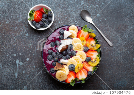 Healthy summer acai smoothie bowl with chia seeds, fresh banana, strawberry, blueberry, cocos, kiwi top view, rustic concrete background with spoon