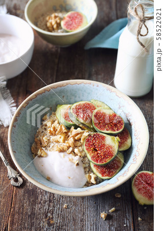 Healthy breakfast: oatmeal, yogurt, ripe figs, walnuts and milk