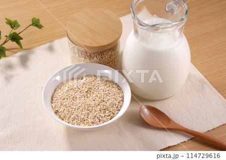 Raw oatmeal, oat flakes in wooden bowl with spoon on linen cloth background