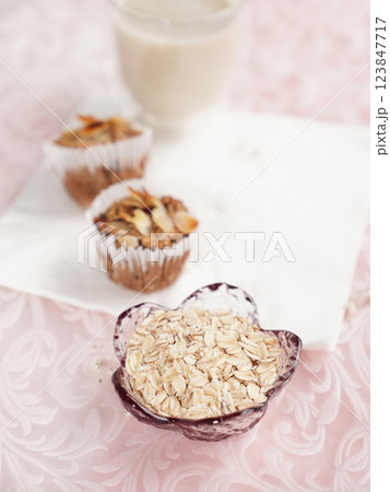 Oatmeal in small glass bowl with oatmeal muffins in background. healthy food.