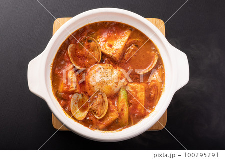 Spicy Korean Pollock Stew Boiling Hot Seafood Soup with Vegetables and Red Pepper Sauce