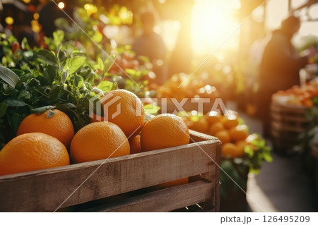 Close Up of Rustic Wooden Stall Showcasing Bright Oranges at Market with Sunlight