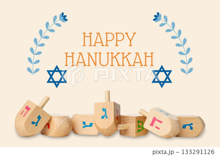 Vector seamless pattern with menorahs and dreidels on blue background. Happy Hanukkah