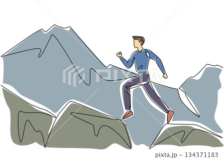 Single continuous line drawing a man running jumping from one large rock to another with a mountain backdrop. Strong marathon runner. Health. National Trails Day. One line design vector illustration