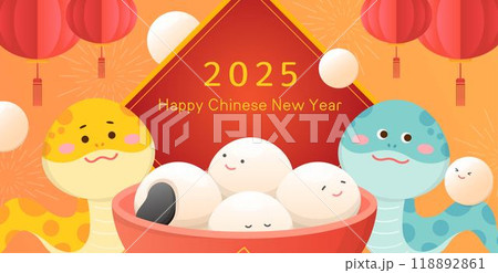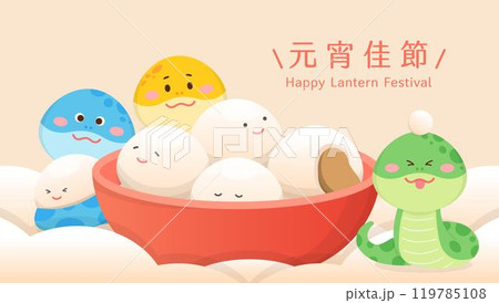 中國元宵節或冬至或新年的海報,蛇與湯圓,亞洲的糯米傳統食物