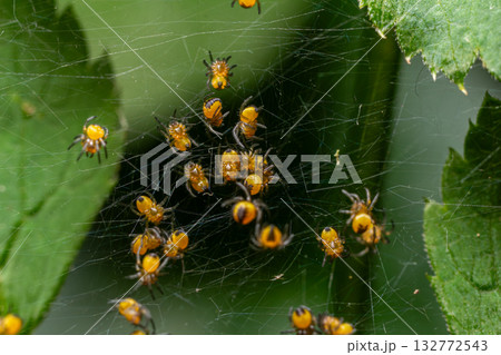 Yellow spiderlings of Araneus diadematus weaving a delicate web in a lush green environment during early morning light
