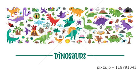 Vector dinosaur set. Cute prehistoric animal icons collection. Dino illustrations with Pterodactyl, Stegosaurus, Tyrannosaurus, Triceratops, T-Rex, paleontologist. Dino party elements for kids