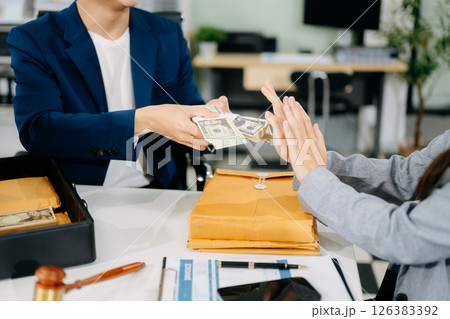 justice and law concept.passing bribe money in the envelop at lawyer office.