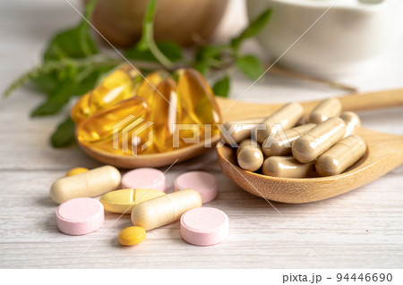Alternative medicine herbal organic capsule drug with herbs leaf natural supplements for healthy good life.