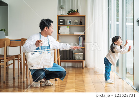 活躍於父親和與孩子一起玩的育兒的人的形象