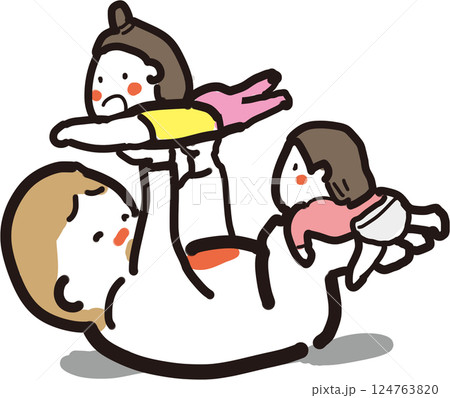 illustration of a father, smiling and looking up, happily holding his laughing baby high up in the air.