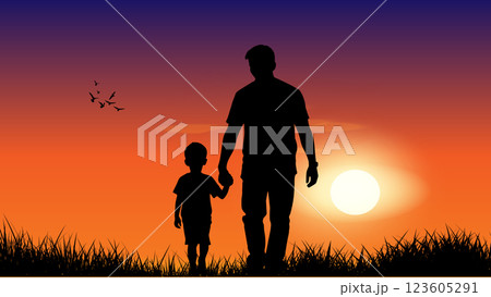 Father and child silhouette at sunset, representing family love, bonding, and memorable moments