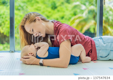 Mother and baby lying on a soft play mat at home, playing, talking and sharing a joyful moment together. Authentic family lifestyle, early childhood development and emotional bonding. Parenting and