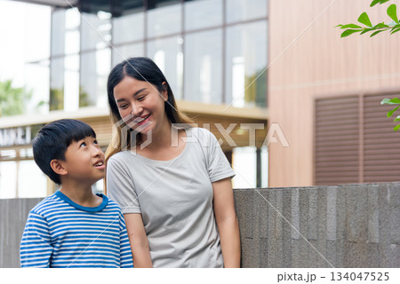 Mother child family woman parent son, people enjoying summer city street outdoors, smiling brightly, sharing joyful moment, spending quality time urban building backdrop.