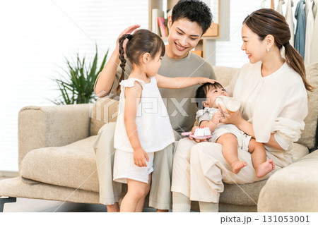 一家人在家裡的沙發上休息,家庭,育兒(育嬰假,育嬰假)